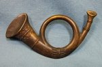 Original period manufacture. Stamped brass Infantry hunting horn emblem with two brass attaching loops soldered to the reverse. Nice dark brass patina finish.