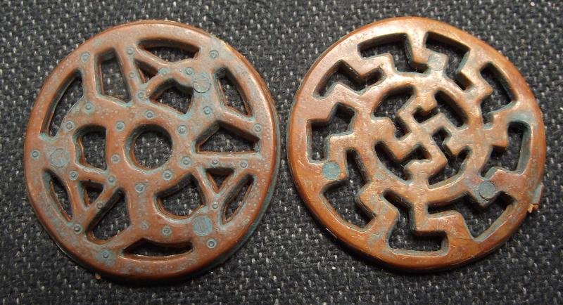 These two example never had a pin to fasten but instead had a thin string to be tied onto the clothing. The condition is very good with a certain amount of its period finish remaining and full details to the rear.