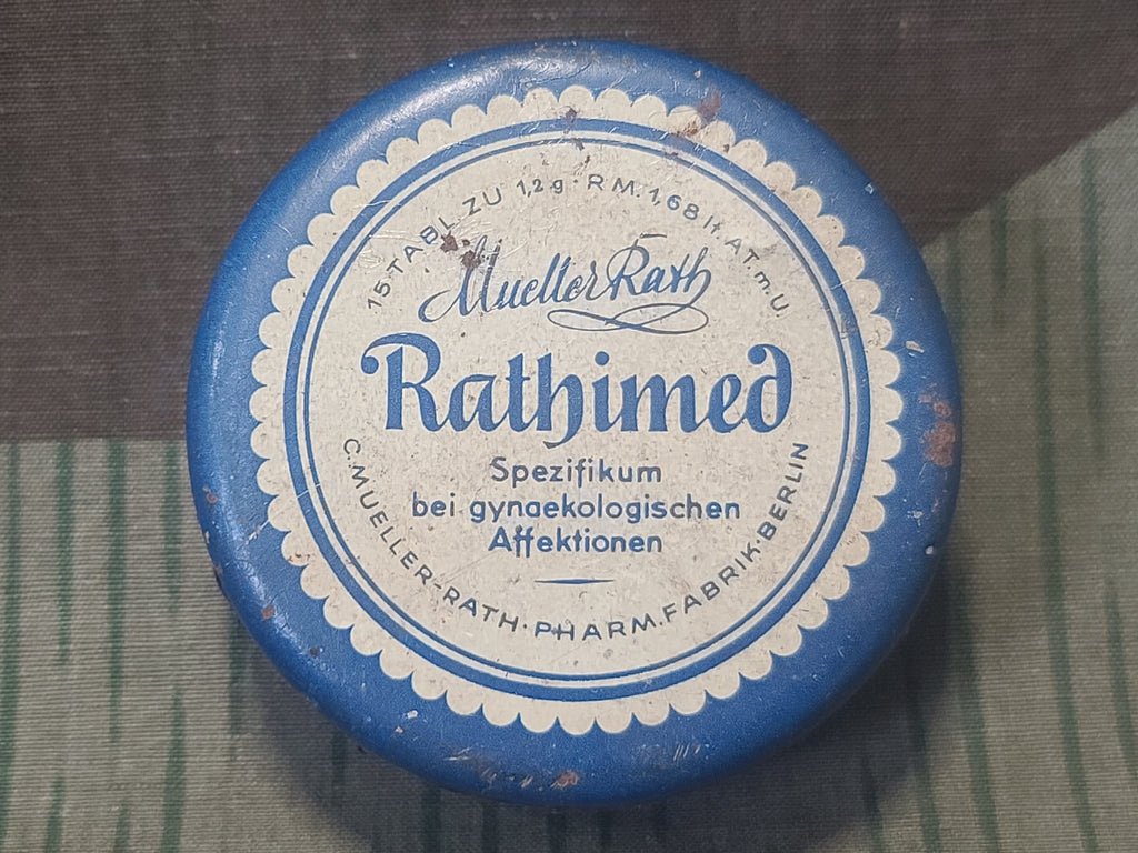 Original Rathimed anti-inflammatory medicine tin specially formulated for gynecological afflictions. The price is in RM (Reichsmark). It originally contained 15 tablets. OK condition. Some wear around the edges and some slight indents. A few rust spots.