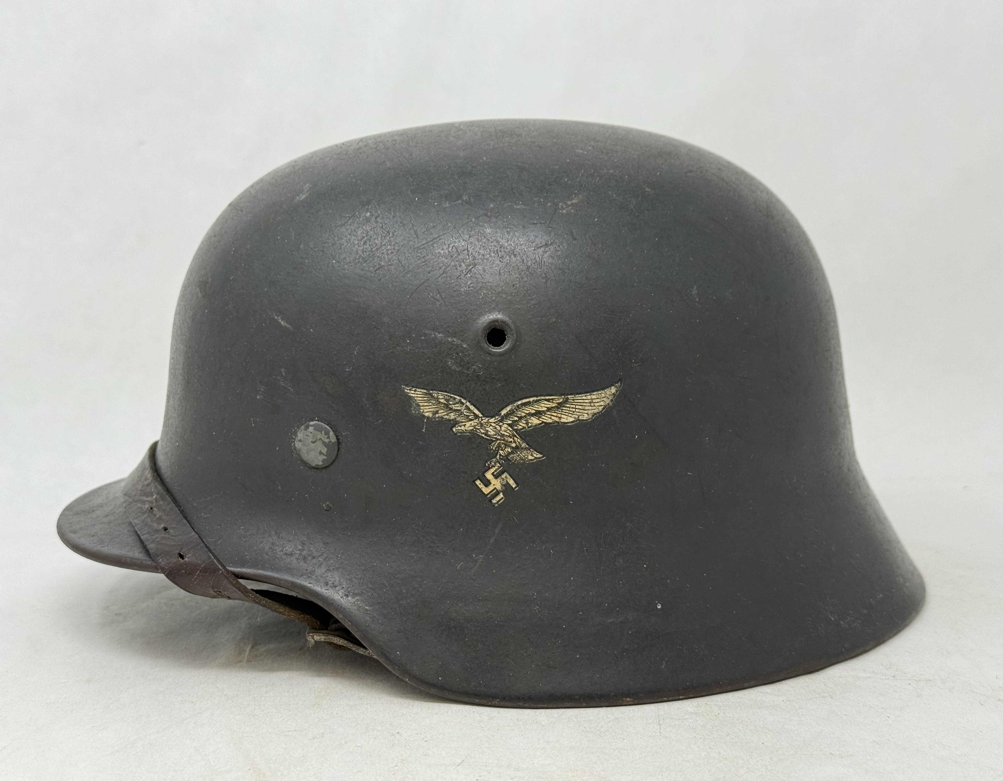 M40 Luftwaffe single decal helmet by ET size 64, batch number 1159. Lightly service worn helmet is complete with untouched liner with a 1942 dated chinstrap and decal that retains most of finish. Nice model m40 for collection. COA accompanied.