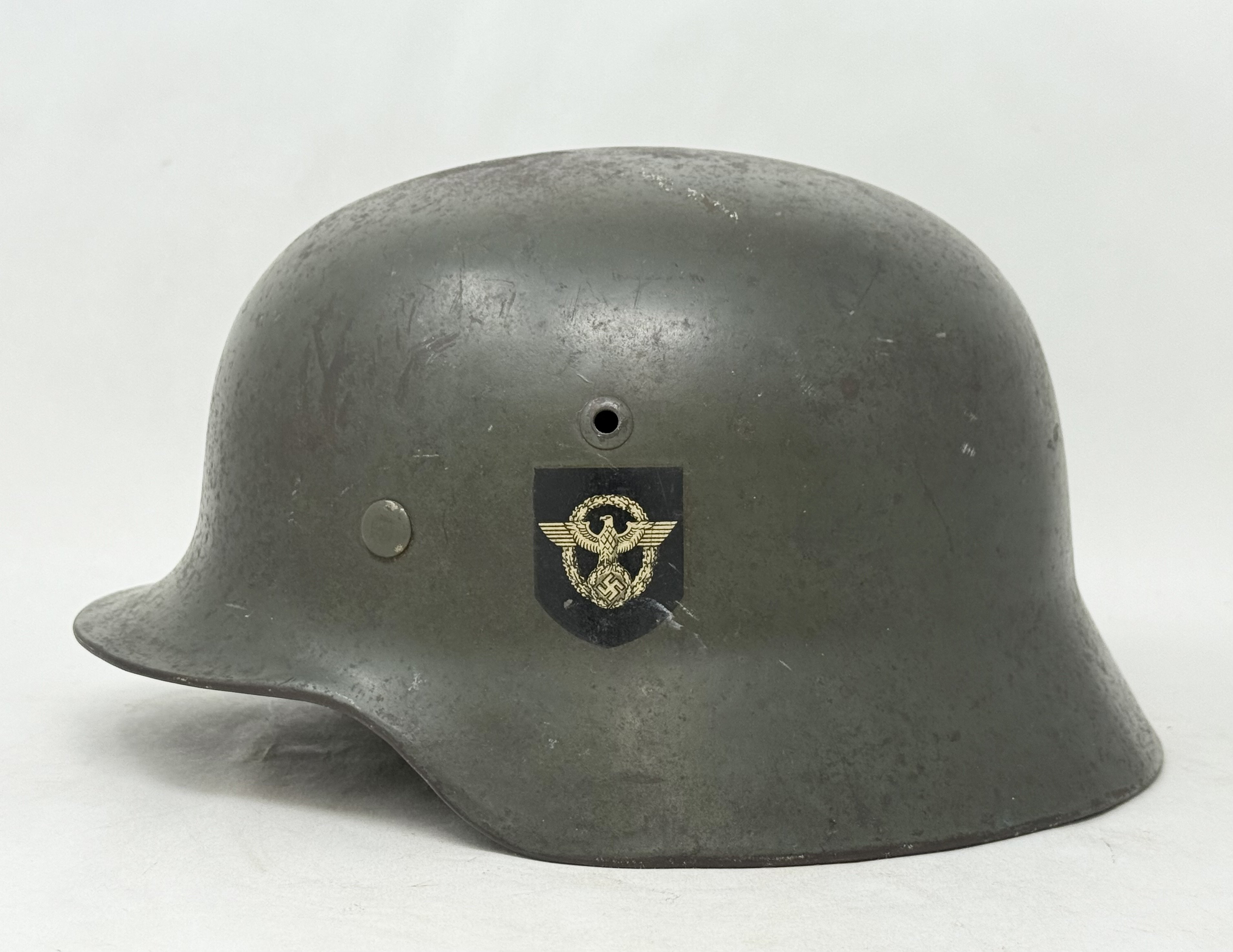 M35 double decal police helmet by ET size 66, batch number T3685. Helmet features an apple green finish with set of near perfect decals with service wear/oxidation mostly on dome. Helmet retains its original untouched named liner with chinstrap. Nice, service worn helmet in the perfect display size. COA accompanies.