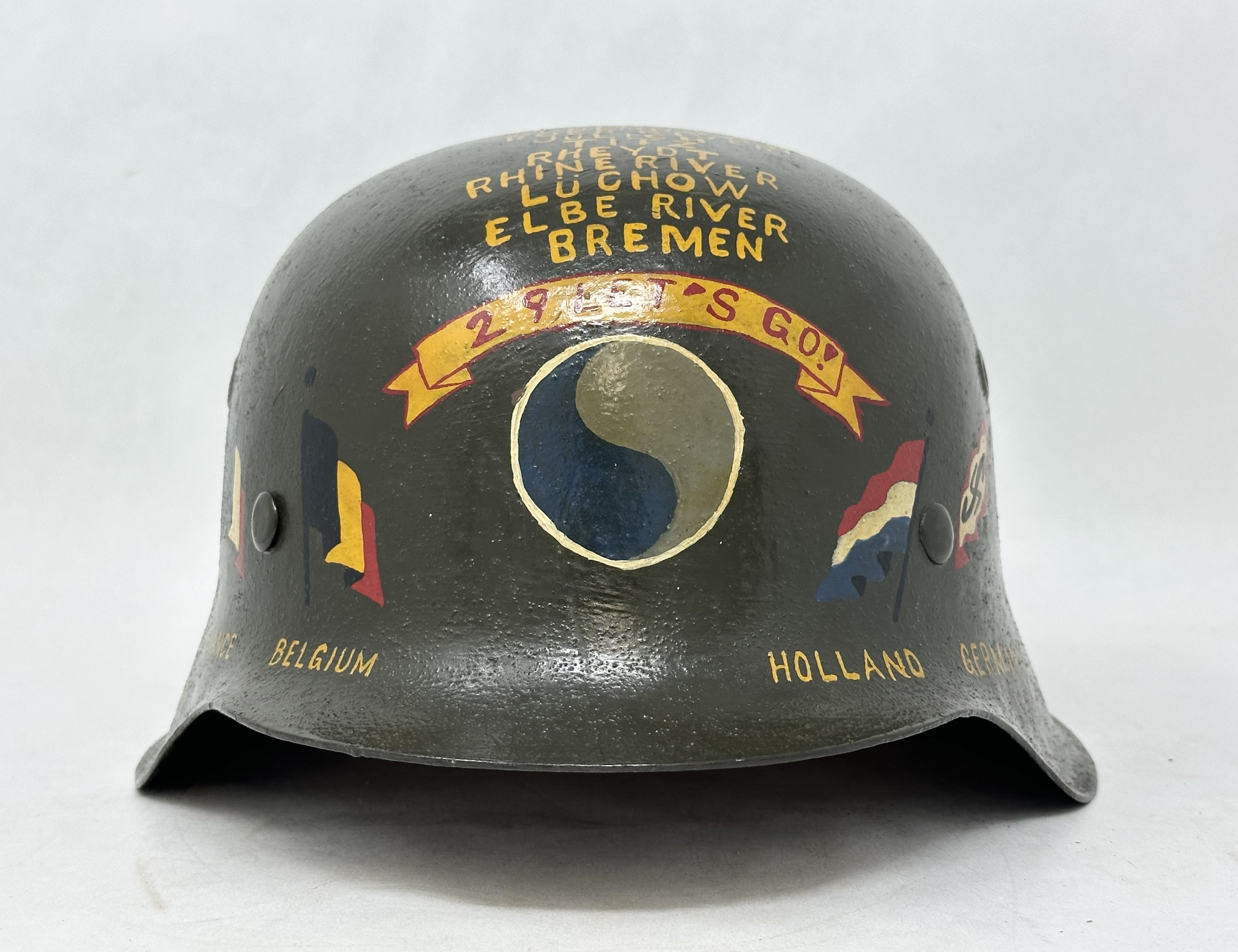 Fantastic 29th division Veteran Art Helmet by ET size 64, batch number 2019. From recent woodwork estate out of Connecticut is a very well done helmet artwork featuring the 29th Infantry Division, nicknamed the Blue and Gray Division, as well as campaigns throughout the war and countries flags the unit has occupied finished with a light clear coat. The helmet has a beautiful condition untouched liner with a rope used to hang the helmet likely done by the veteran many years ago for suspension. The name 'Funk' can be seen scratched in rear skirt and written in liner. Other examples from 29th division painted helmets are of similar design and rare to find. This is a beautiful example now available on the open market. COA accompanied.