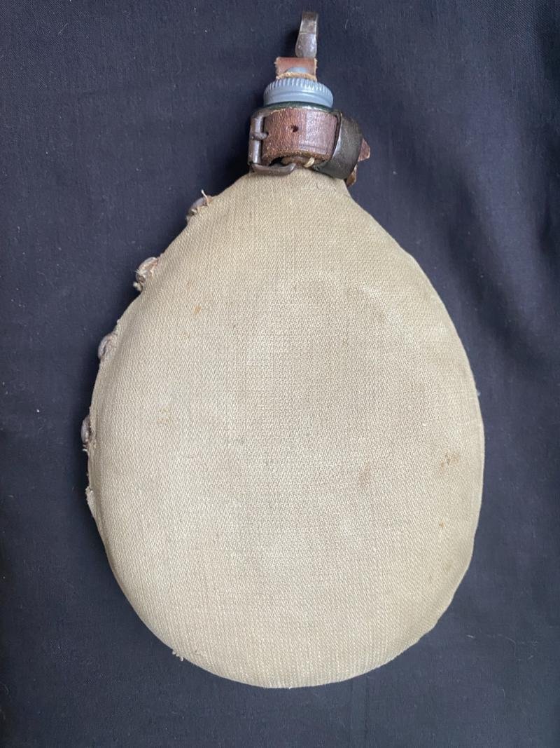 This is a WW1 German Water Bottle with a rare gabardine cover, the bottle is made from a blue enamel, someone has replaced the cork on the lid with a modern one and used a modern bolt to keep in place, the leather straps is very nice and on the back of the bottle, some original markings can be seen.