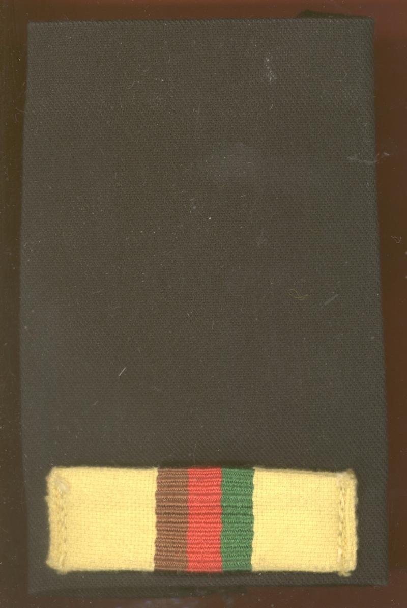 A fine black cloth slip on with woven colours brown, red and green on yellow bar. Slot cut into the rear GC.