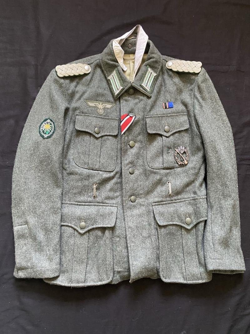 This is a very nice reproduction WW2 German Gebirgsjager (Mountain Troop) tunic which is fitted with the Edelweiss arm patch, shoulder boards and collar patches as well as the Iron Cross Ribbon and a Infantry Assault Award badge, Approx. 38' chest and 18' under the arm.