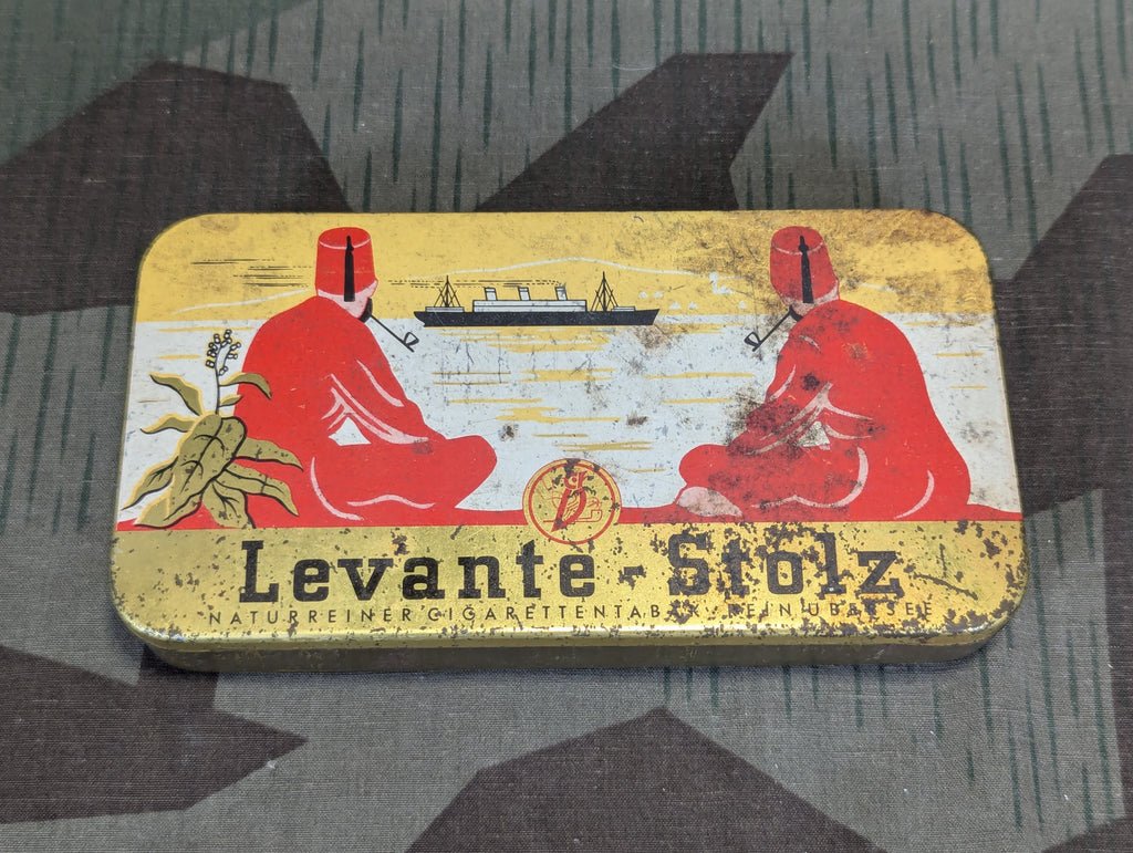 German Levante-Stolz loose pipe or cigarette tobacco tin. It is a bit worn, but the graphics are good.