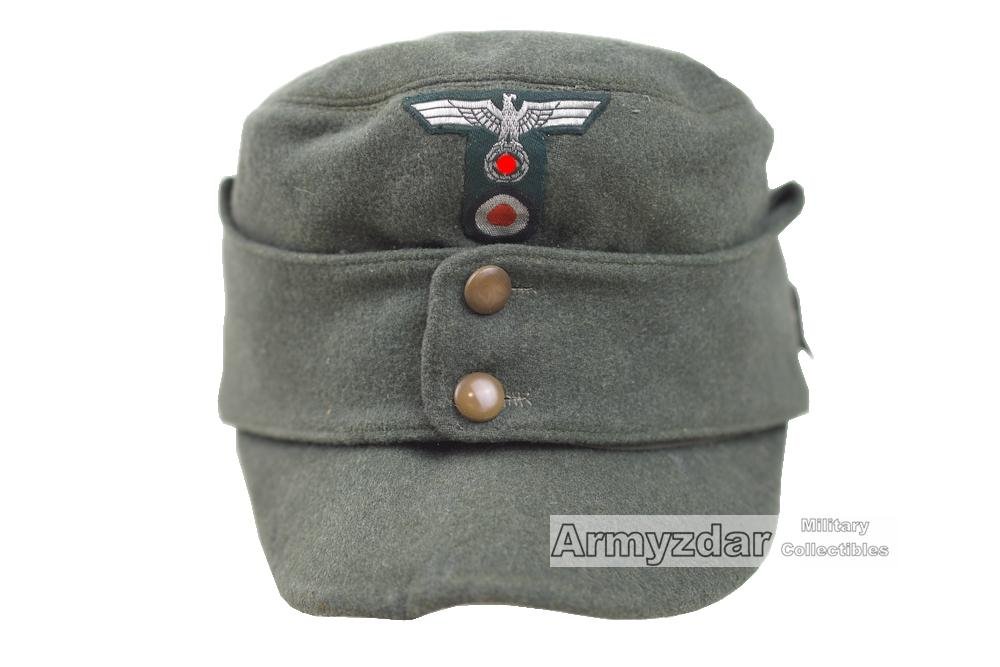 This is a rare German Wehrmacht officer field cap 'BergmĂŒtze' in a good used condition. The cap is untouched as was found in Austria. It has original sewn officer woven T-shape insignia. The cap has several small moth holes and sweat band is period hand repaired. On the silk lining is pressed maker's logo.