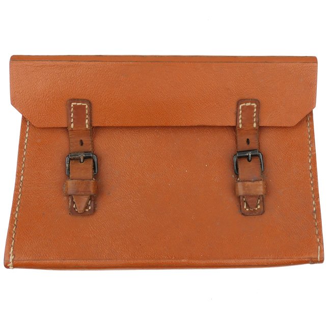 Unkown German Pouch made of 'Ersatz' Material. The typical German Wehrmacht construction pouch is made from licht brown simulated leather, so-called 'Preßstoff' (Ersatz) material, closed by two brown leather straps with black roller buckles. Possibly the pouch was intended for medical material inside a medical box. The pouch is not visible maker marked or dated. The pouch is sized approximately 25 x 18 x 6 cms. Interesting original pouch!
