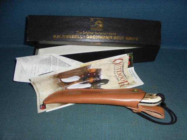 This is the deluxe model 3 with a 4' blade stamped DH Russell Grohmann 3 Stainless on one side and Canada on the otherThe knife is 8.25' overall with a Stag horn grip (I've never seen before on a Grohmann knife), and it comes with its original sheath box and booklet S/n 02977Price includes UK delivery