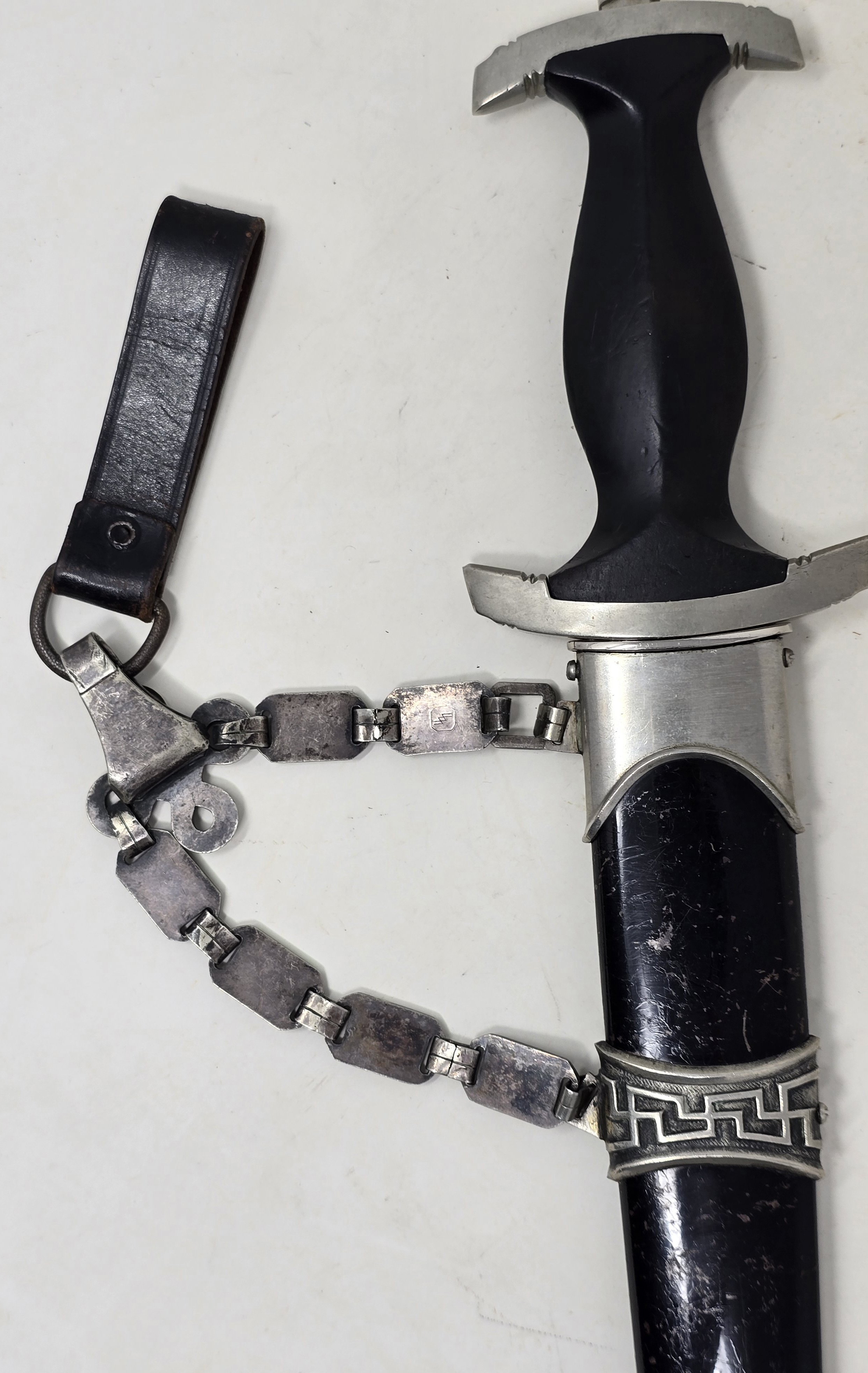This is a stunning example of an SS chained dagger that is correct in every sense, with beautiful cross graining still throughout the blade, which features a fine inscription. All parts are original and unchanged, and no dings or dents in the scabbard or tip. A beautiful example, verified original, priced reasonably. COA accompanies.