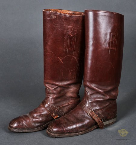 Vintage Military Boots-These are 'Panther' brand. I could not find anything related to that, but we believe these are vintage military boots. They measure 16' tall. The brown leather has some minor scuffs etc. but these are in overall good condition. There are metal straps applied to the heel of each, and one has a metal toe plate attached (the other one is missing) to what appears to be old replacement soles. These are approximately a size 10. A good deal!