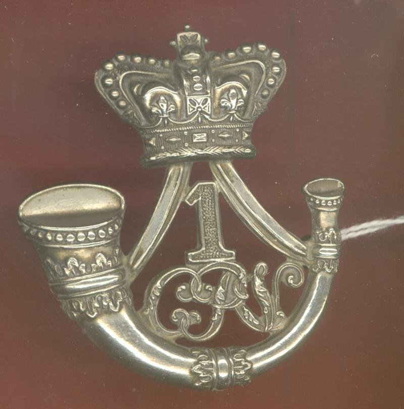 A fine scarce die-stamped white metal example worn circa 1860-87. Crowned strung bugle with '1' over 'CRV' cypher between the strings to voided centre, Two toned loops to the reverse. VGCFormed 15th February, 1860 at Carlisle. Following consolidation in 1880, became part of 1st (Cumberland) VB Border Regt. in December 1887.