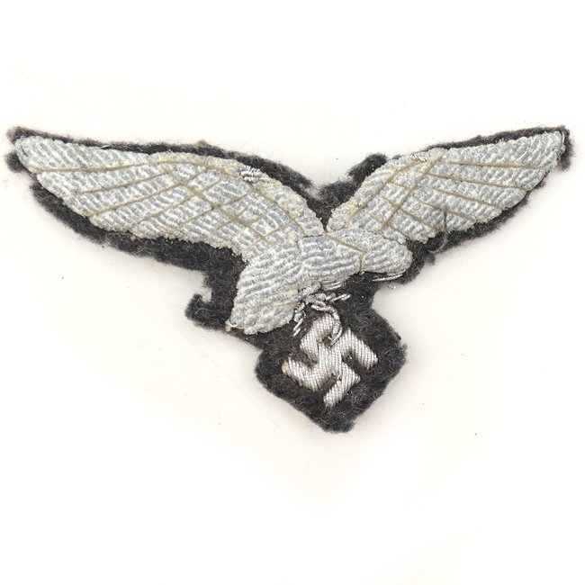 Luftwaffe Officer's Breast Eagle (Hoheitsabzeichen), early pattern with drooptail. This is a breast-eagle as worn on the various Luftwaffe officers tunics. This example is nicely hand-embroidered using silver braid on a regular type Luftwaffe grey wool. There is some minor moth damage. The eagle is showing some oxidation. Still a nice original eagle, priced accordingly!