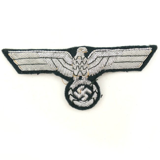 This is a nice example of a hand-embroidered Wehrmacht (Heer) Officer's breast-eagle (Hoheitsabzeichen). Breast-eagle as worn on the various Wehrmacht officer's tunics. This example is nicely hand-embroidered using silver braid on a early M36 style dark-green wool. Nice example in good used condition, perfect to restore a Wehrmacht officer's tunic with!