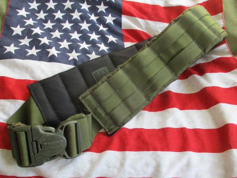 A GENUINE BLACKHAWK molle belt IDEAL AS A FIGHT LIGHT / SHOOTERS BELT !!!features = WITH FULL MOLLE 2 ROW . SIDE ONES ARE DOUBLE SIZE LOOPS TO FIT DROP LEG THREW , PADING FOR COMFORT AND COOLMAX INNER ..BEST THERE ISSIZE = label has s on it but no way a size small - MEDIUM TO LARGE ... TO FIT 32' TO 44' WAIST PAD MEASURE 81CM LONG OR 32 INCH AND 15 CM TALL AT BACKCONDITION = WORN UsED ALL OK AS IN PICTUREScolour = og green ... used bu uksf / sas / uksfsg 1 para ...ideal to add extra ally spray paint camo to or crye multicam pouches look mega on it
