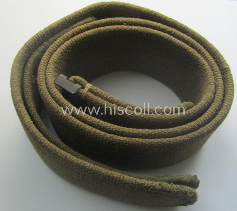 This is an attractive - and I deem only moderately used- and/or worn - example of a WH (Heeres ie. Luftwaffe etc.) 'tropical-issued'- and/or entirely 'web-based' belt (ie. 'Koppelriemen') as was executed in greenish-tan-coloured and/or neatly woven linnen (ie. 'webbing') and having a linnen-based tongue, being a neat example that is approximately 95 cms. sized and that comes in an overall very nice- (ie. most certainly issued- albeit minimally used- ie. worn-), condition. The belt shows a (somewhat vaguely present and regrettably hard to read) stamped makers'-designation ie. 'RbN'-numeral (which is impossible to decypher as can be seen on the pictures) and does show a blue inked size-stamp under the tongue (that reads: '95') as can be seen on the pictures. The belts'-tongue is as stated fabricated in typical, greenish-coloured linnen (as can be seen on the pictures). The piece was just moderately used and its overall condition is still very nice and of course fully functional. The metal-based catch retains most of its greenish- ie. typical field-grey-coloured finish. Hard to find a more nicely preserved and/or attractive example for a more interesting price: the belt just needs an equally nicely preserved 'Heeres' ie. 'Luftwaffe'-type belt-buckle to complete it. I deem that this nicely preserved example is accordingly priced!