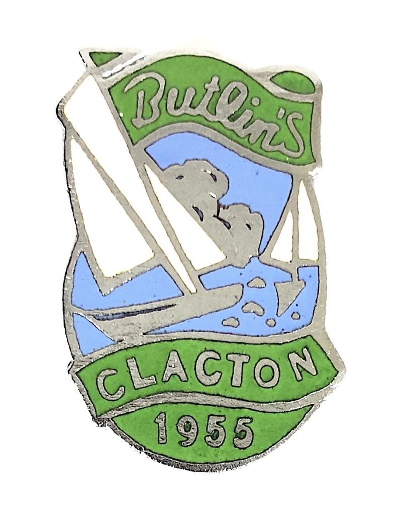 A scarce original 'Butlin's 1955 Clacton holiday camp chromium plated pin badge' with green enamel labels and white sails. Very good condition, complete with original pin fittings, no damage to the enamel.Height approx 28mm.