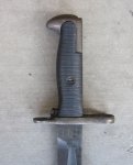 Original period manufacture. Manufactured 10 inch blade with clear markings on the ricasso. Nice amount of original finish remaining on the blade, guard and pommel. Intact black plastic grips. Clean bayonet. Since we first listed this bayonet, we have added an original WWII GI scabbard, lazy S below the US stamping on the throat.