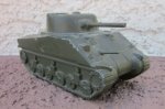 Original period manufacture. OD painted metal tank model of the M4 Sherman tank. Possibly of Comet manufacture. Measures 6.25 inches in length, minor paint loss, no damage.