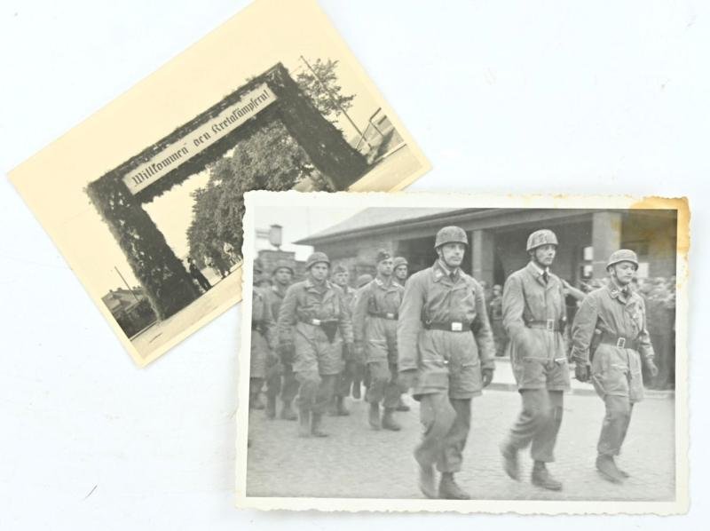 In a very nice condition a German Luftwaffe Fallschirmjager Picture set.The set contains two original pictures.The large picture contains 3 German Paratroopers marching after there capture of Eben-Emael. The reverse side of the picture, that comes in a size of 8x12cm, ahs the name of the three paratroopers written. ....., Koch and Witzig.Attached to the paratrooper picture is a picture of a welcome bow for the Paratroopers of Crete.This picture is smaller in size and approx 5x8cm in size.A very nice set of two pictures!