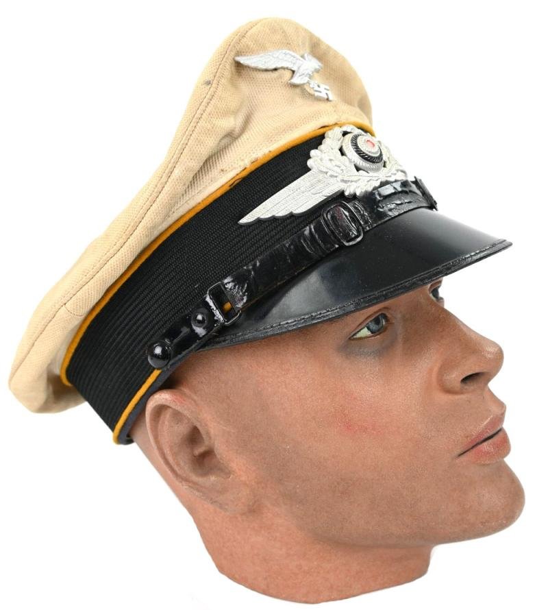 In a very good condition a stunning and hard to find German Luftwaffe Summer Visor Cap for Enlisted Men/ NCO.The visor cap comes in a good mannequin head size 58 and has the orginal insignia attached.The visor has the yellow piping, indicating use by flighing personal or paratroopers (fallschirmjager).Inside the linning the cap is maker marked Clemens Wagner Meiser Klasse.A very hard to find cap!