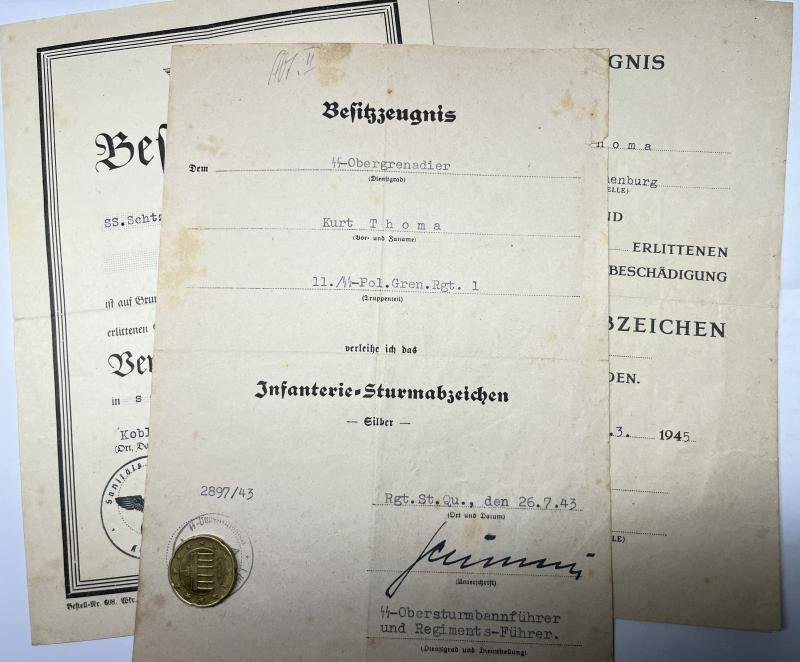 'Waffen-SS' citation grouping of 'SS-Unterscharführer' Kurt Thoma who served within SS-Pol.Gren.Rgt.11) BWB citation of Thoma serving within Inf.Rgt.1 of the SS-Pol.Div.The document has been signed at Koblenz by the commanding medical officer.2) 'Infanterie-Sturmabzeichen in Silber' citation which has been signed by 'SS-Obersturmbannführer' and late 'SS-Oberführer' (posthumously) Karl Schümers (DKiG 3-8-1942,RK 30-9-1942)Schümers was killed in mineexplosions by Greek partisans!3) SWB citation of Thoma who served by then at 'SS-Unterführerschule Lauenburg' !!,which has been handed out at Res.Lazarett Duderstadt and which has been signed by the commanding medical officer.Thoma must have been wounded during the fightings with russian forces on 12-3-1945Nice grouping!!