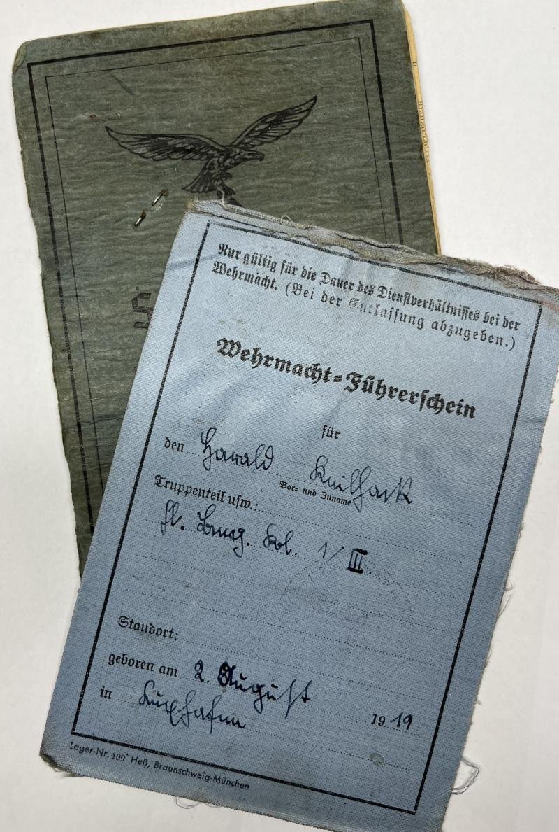 Soldbuch and drivers license of 'Feldwebel' Harald Keilhack who served within several different Luftwaffe units before he finally ended-up within Gren.Rgt.1209 of the 159.Inf.Div.1) Soldbuch of Keilhack who served mainly in France before he was transferred to 159.Inf.Div.Within this division ,Keilhack participated in fightings in the Alsace region in actions against french and american forces.Keilhack was awarded the KvK II m.Schw.The entry on top of page 22 mentions participation of Keilhack at a 'Panzervernichtungs und Nahkampflehrgang' (tankdestruction and closecombat course) in Bordeaux from 29-11 to 4-12-1943 and a 'Nahkampflehrgang für Offizieren' (closecombat course for officers) at the 'Kompanieführerschüle' in Tours2) Not that often seen bleu drivers-license!Nice Soldbuch!!