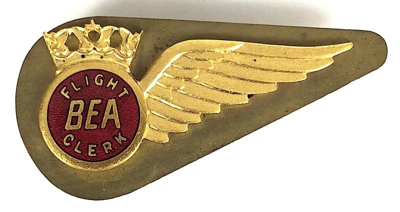 A very rare ORIGINAL circa 1946 to 1974 period 'British European Airways BEA Flight Clerk badge'; gilt half wing the Astral Crown centre inlaid with red enamel inscribed 'Flight BEA Clerk'. Very good condition, complete with original screw post fittings, backing plate and nuts, no damage to the enamel, an excellent example.Size approx 51 x 25mm.A BEA Flight Clerk would have been responsible for various tasks related to passenger and baggage handling, including check-in, boarding, and providing customer service.