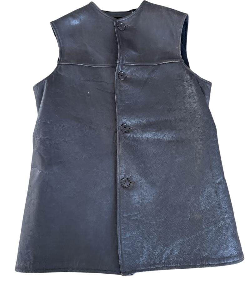 Canadian Leather Jerkin; makers marked Joseph Gould & Sons Ltd from Toronto and 1943 dated. This piece is retains its original manufacturer's label; dated 1943, and stamped with the distinctive Canadian-style broad arrow.Sized Small, the jerkin remains in lightly used condition with supple leather showing minimal wear and excellent preservation. IMO in near mint condition. Hard to find a Canadian leather jerkin in such condition, hard to be upgraded!