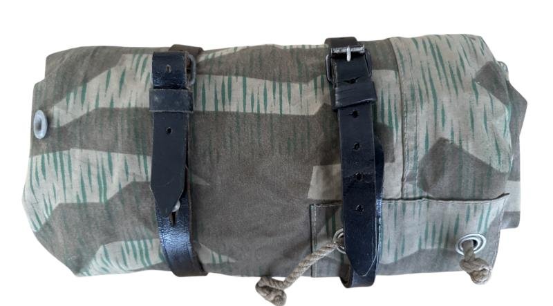 WH (Heer) M31 Shelter Quarter (Zeltbahn 31). with two leather straps Executed in 'splitter pattern' camouflage. The shelter quarter shows some light usage. There are no visible date or makers markings . Named Overall in excellent i.e. light used condition.