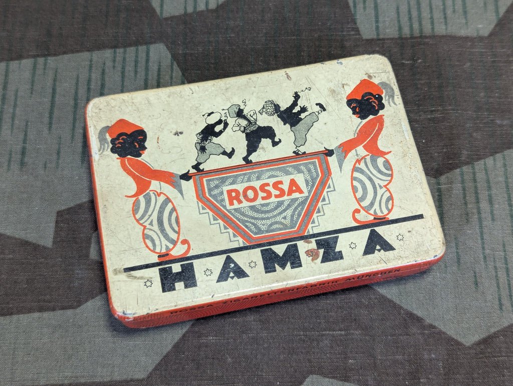 Very nice original Rossa Hamza cigarette sales tin for 20 cigarettes. It has some wear and a bit of remnant tax seal. Nice colors and graphics. Pre war, probably 1920's. This was a Munich based cigarette maker.