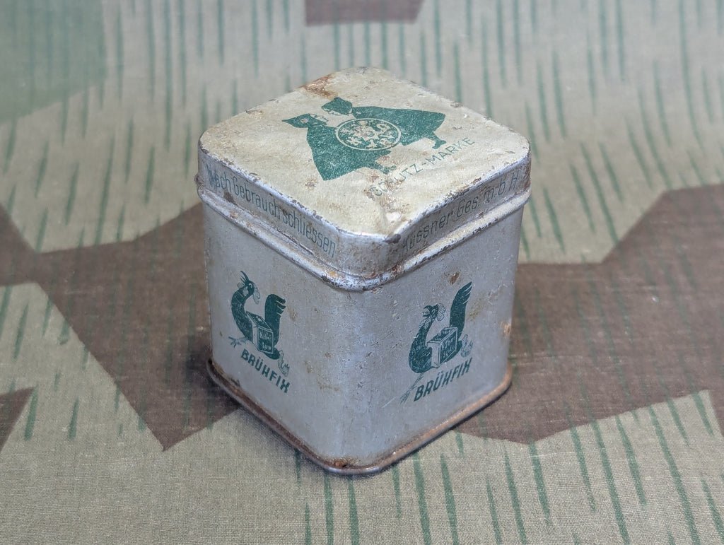 Original Brühfix bouillon cube tin from Vienna. It is a little beat up but still nice. I like the chicken graphics on the sides. It is a small tin that would have held 10 cubes.