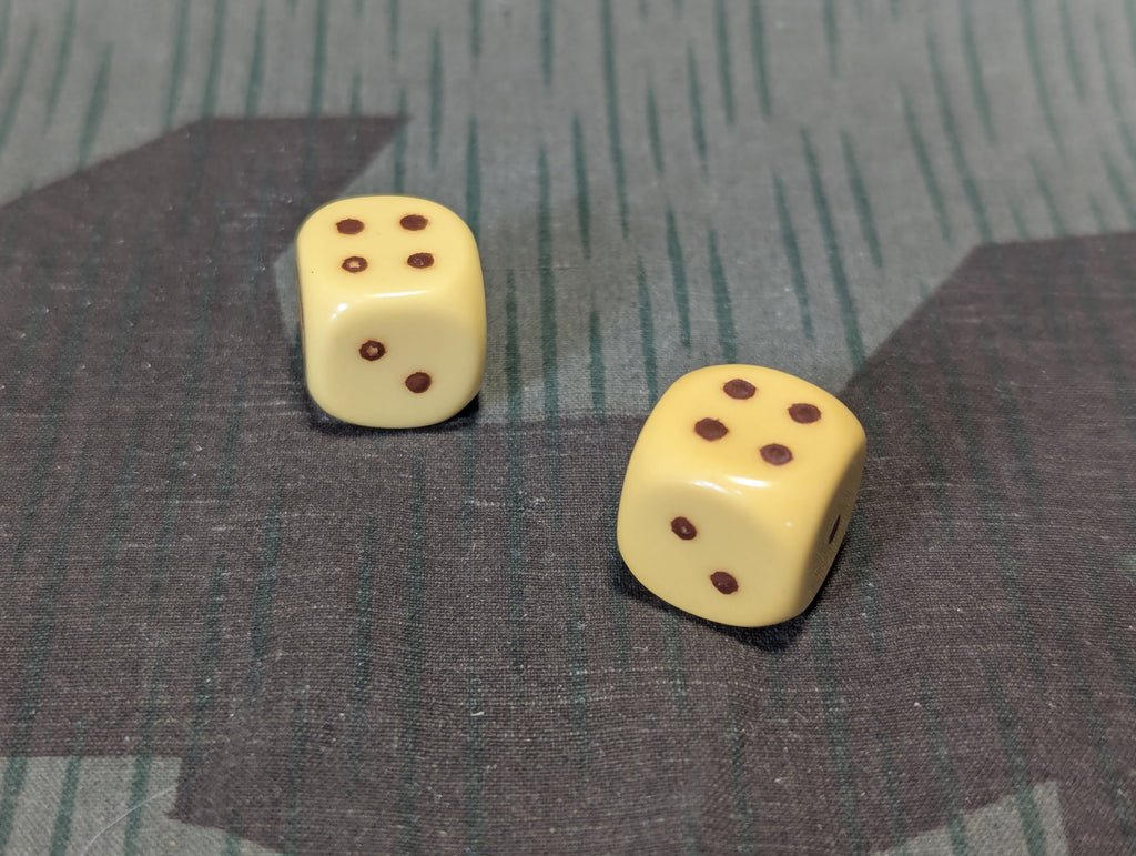 Period pair of Bakelite dice.Price is for two dice.They are all in decent usable condition, although they do show some signs of wear / use and some discoloration from age. We did try to match the two dice by shade.