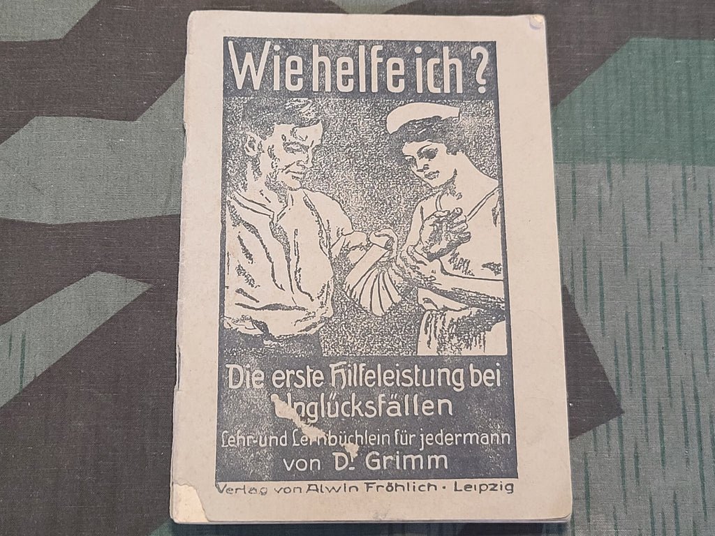 Original 1939 'Wie Helfe Ich?' ('How do I Help?') first aid book for everyone. There is a name and feldpost number written inside. This edition also has an extra few pages on poison gas. It is in decent condition with a little staining and wear.