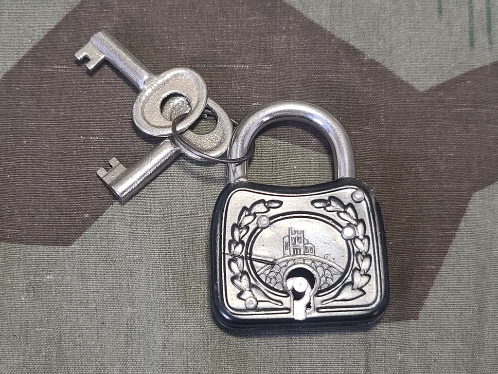 Vintage German lock with 2 keys. Padlock has a wreath design and the Burg castle logo. In working order. Overall fairly good condition, but there is a deep scratch on the front.
