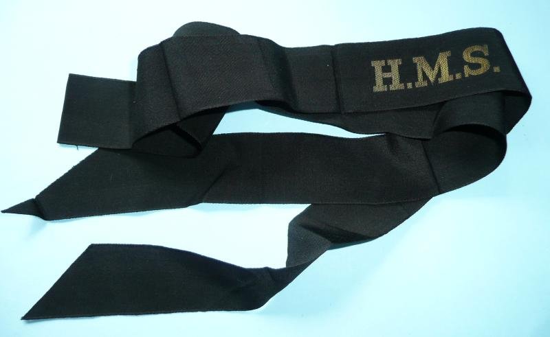 Full-length WW2 ribbon with gold-wire woven title 'H.M.S' (Note full-stops).At the start of World War 2, for security reasons sailors stopped wearing cap-tallies showing their ship's name. Tallies bearing HM Minesweeper and HM Destroyer were eventually replaced by a universal tally bearing only 'H.M.S.'This tally has been worn but is in very good condition.Coll