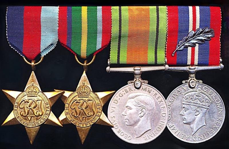 - The 1939-45 Star. No clasp- The Pacific Star. No clasp- Defence Medal- War Medal. With Mentioned-in-Despatches 'Oakleaf' emblemThe 'Stars' only are military-tailors contemporary copies - the medals are both Royal Mint issuesAll medals equally toned and fitted with silk ribandsThe Pacific Star 'Quartet', was awarded to all British and Empire forces personnel who were serving in Malaya, Singapore and Hong Kong on 8 December 1941, and had been in theatre for at least six months prior to the start of the Pacific WarAll medals are professionally mounted in the swing-style, and suspended from a white metal mounting bar that retains its long hinged pin and clasp fittingCondition: GVF