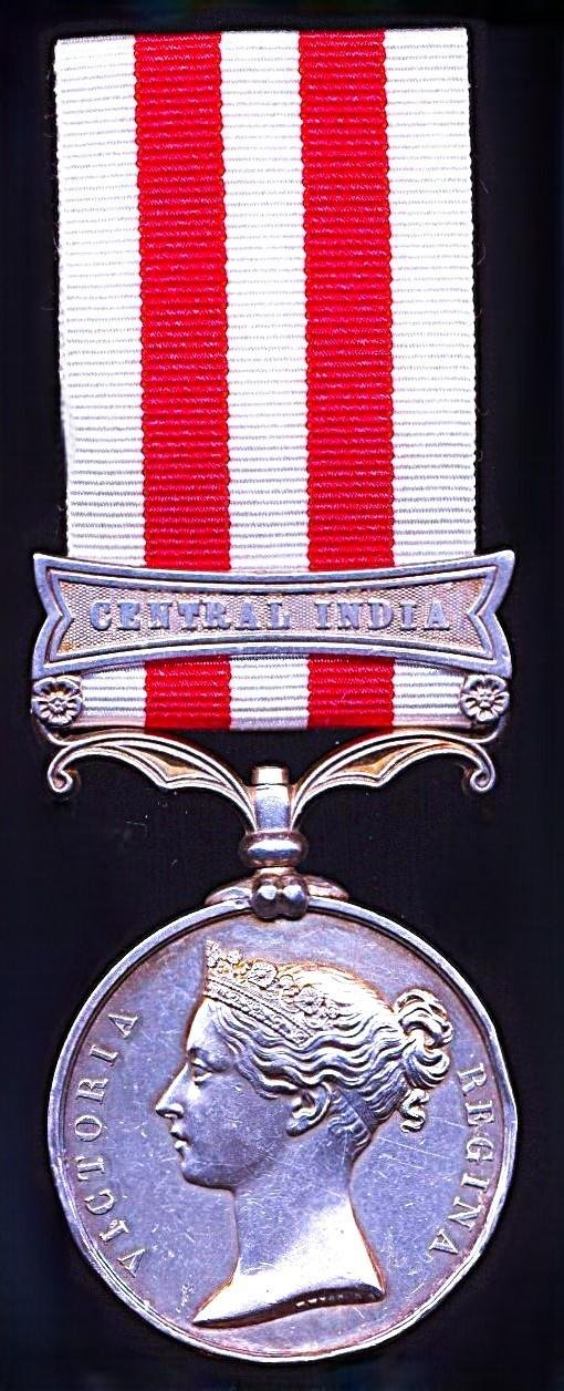 Medal & Clasp Verification: Private Arthur Price of the 3rd Bombay European Regiment, Bombay Presidency Army of the Honourable East Company is confirmed entitled to the medal and clasp per the respective medal roll cited below:- Indian Mutiny Medal & clasp 'Central India': Indian Mutiny medal roll, 1857-1859 British forces. by Kevin J Asplin. British Library OIR Ref 355.134One of 689 x Central India Clasps awarded to the RegimentThe below following service details are from the lists of soldiers of the Bombay Army taken from India Office Records L/MIL/12/113Arthur Price was a native of London, Middlesex, England. Prior to entering the service of the Honourable East Indian Company in 1854, he had been employed as a 'Footman'. He attested for the HEIC Land Forces on, 12 June 1854, for a contracted period of 10 years. Arthur subsequently embarked for India aboard the 'Euphemus' for his voyage to India. On arrival in India, he was posted to the 3rd Battalion European Regiment, an infantry regiment of the HEIC's Bombay Army, in which regiment he held the regimental number '697'.The 3rd Bombay European Regiment was extremely heavily engaged with Sir Hugh Rose's Central India Field Force. They saw action at Rahatgarh, Garhakota and Jhansi where they were central to the British success at Betwa with two of the fifteen British deaths being men of the 3rd. After Jhansi fell some men of the Regiment were left there as garrison while the rest joined the army at Lohari where Private Frederick Whirlpool won the Victoria Cross. There final action was the capture of Kalpi where the Regiment Garrisoned the town, allowing General Rose to march on and retake GwaliorEdge bruisingCondition: About VF