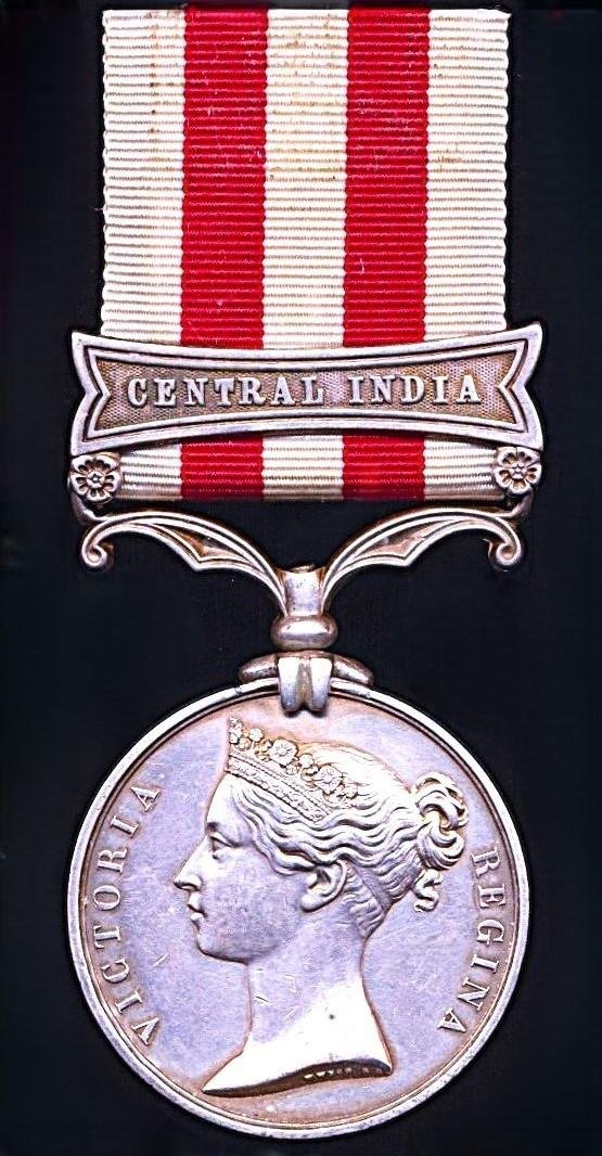 The medal fitted with a neat replacement claw mountMedal & Clasp Verification: No. 1793 Gunner William Webb A Troop Horse Brigade Madras Artillery, of the Madras Presidency Army of the Honourable East Company is confirmed entitled to the medal and clasp per the respective medal roll cited below:- Indian Mutiny Medal & clasp 'Central India': Indian Mutiny medal roll, 1857-1859 British Forces. by Kevin J Asplin. British Library OIR Ref 355.134Condition: Replacement claw, otherwise about VF