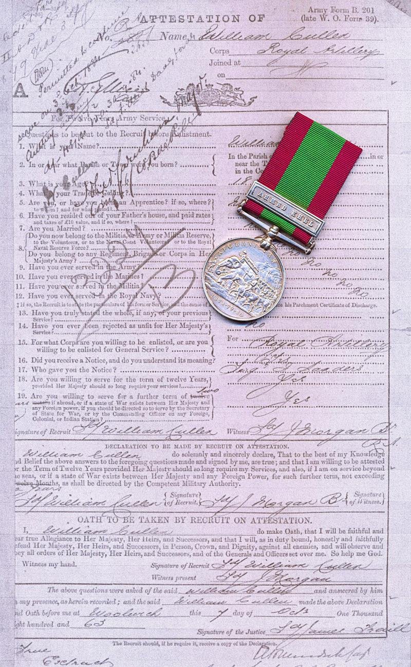 Medals & Clasps Verification: Driver William Cullen's entitlement to the Afghan Medals & clasp is confirmed in the respective medal rolls referenced below:- Afghan Medal & clasp 'Ahmed Khel': WO 100/54. Medal issued to recipient on 22 November 1881Reference 'British Battles and Medals. Seventh Edition (Spink, 2006) there were 168 x 'Ahmed Khel' clasps were awarded to A Battery, B Brigade of the Royal Horse ArtilleryBattle of Ahmed Khel: The battle was fought on 19 April 1880, during the second phase of the Second Afghan War. The British and Indian Army suffered an estimated 17 x killed in action, and 124 x wounded at the battle of Ahmed Khel against an estimated loss of x 1,700 incurred by the AfghansWilliam Cullen, son of William Cullen and Elizabeth Cullen, was a native of Waterford, Ireland where he was born in 1845. By trade a 'Butcher' William Cullen was described as being 18 years of age when he joined the British Army at, Woolwich, England, on 7 October 1863. On enlistment he was posted to the Royal Regiment of Artillery. By the time that he took his final discharge from the British Army on 30 December 1884, William Cullen had racked up 21 years & 84 days reckonable service towards pension. His conduct was described as having been 'Very Good'. William's record of service during his military career was:- Home: 07/10/1863 - 16/01/1873- India (inc Second Afghan War): 17/01/1873 - 09/03/1882- Home: 10/03/1882 - 30/12/1884The recipients service papers are extant and accessible at The National ArchivesCondition: About VF