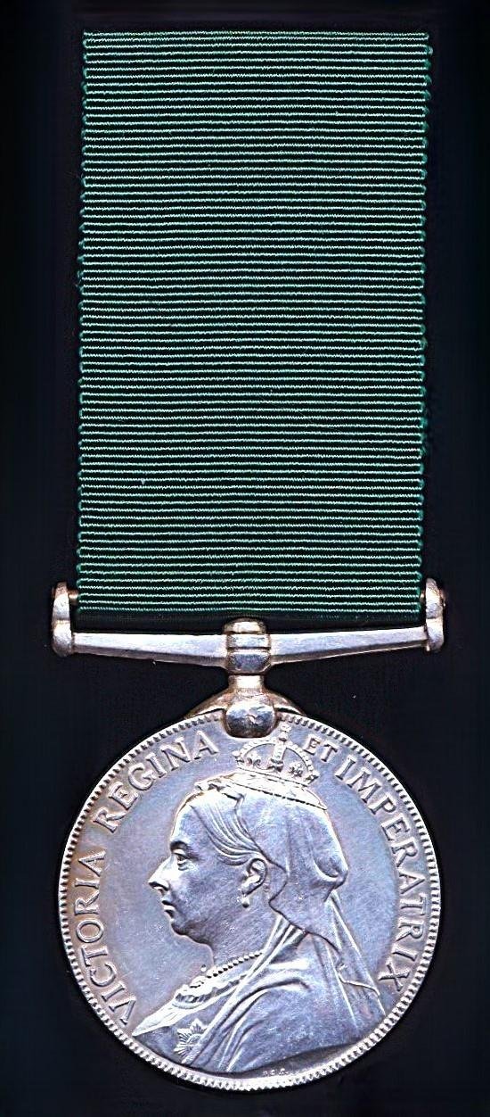 The naming in engraved script fills the entire rim of the medal, and is a master-class example of an engraver's skill in craftsmanshipMedal Verification: The award to Sergeant Thomas Arthur Kingsley of the Madras Volunteer Guards was published in the Gazette of India issue 569 of 1897, and was one of only an estimated 65 x VLSM's (Victorian issue) awarded to the regiment in the period 1897-1901 (inc)Thomas Arthur Kingsley son of William Thomas Kingsley (an Apothecary / Sub Assistant Surgeon, Madras Presidency Army 1804-1862) was born circa 1846. He is recorded as employed as a 'Clerk', 27 years of age, and resident of 'New Town', Madras, India, when he married Elizabeth Charlotte Trotter described as 19 years of age, and daughter of Charles Solomon Trotter, at St. Mary's Church, Fort St. George, Madras, British India, on 1 September 1873. The couple were subsequently blessed with seven children, comprising one son and six daughters, who were born variously in British India 1874-93The Madras Volunteer Guards were the senior-most infantry regiment of the Indian volunteer movement, and have their origins dating back to the year 1857 - the year of the Indian Mutiny - when the Madras Volunteer Guards were raised as a precautionary measure. With the creation of the Indian Defence Force in April 1917, the unit was restyled '1st Madras Guards'. On the subsequent creation of the Auxiliary Force India in 1920, the unit was re-styled 'The Madras Guards'Condition: About EF