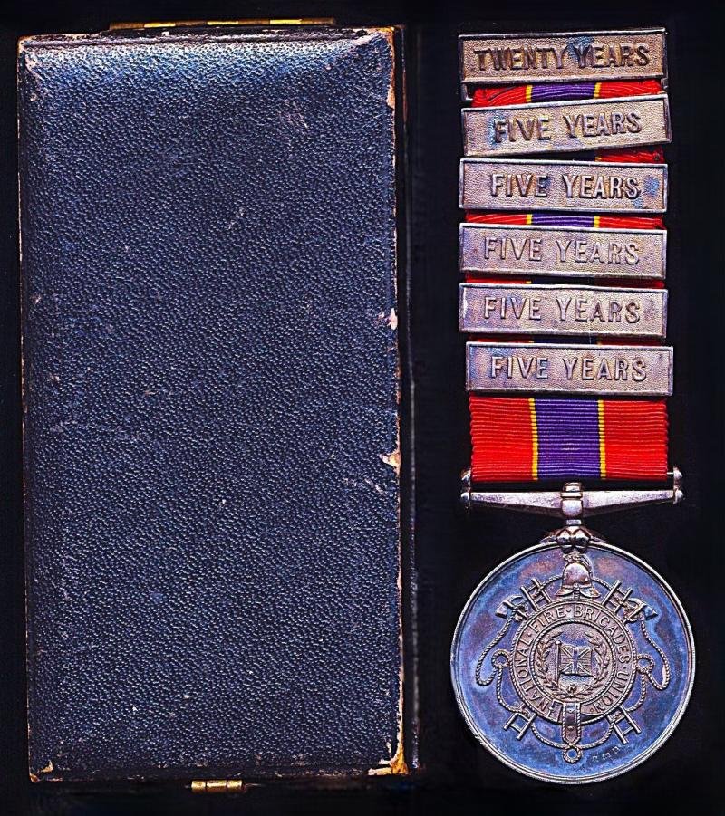 Sold together with:- Original hinged case of issue with named and dated award transmittal cardThe award card named to Omer Burnell of the Southam Fire Brigade and dated 21 June 1909, and confirms the register number 408 and 'Twenty' yearsThe reverse of the medal uncommonly - and most attractively - with finely engraved monogram of the Southam Fire Brigade with intertwined gothic letters S.W.B.Omer Burnell had an extraordinary record of long service with the Southam Fire Brigade - newspapers indicating more then 52 years service!Omer Burnell's Fire Services are recorded in numerous local 'Warwickshire' county newspapers, including with captioned photograph in at least one articleA medal of considerable Southam local history interest, and to a family who provided several generations of volunteers for the Southam Fire BrigadeCondition: Toned EF