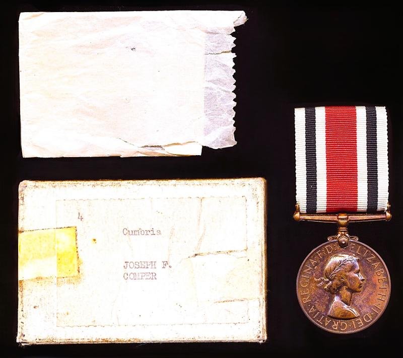 For service with the Cumbria Special ConstabularyMedal retaining its original riband as issuedSold together with white named card box of issue, with label named and showing the recipient was a member of the 'Cumbria' Special ConstabularyJoseph Frederick Comper son of Thomas James Comper and Ada Comper (nee Burrage), was a native of Horsham, Sussex, England where he was born on 24 December 1913. While serving with his local county infantry regiment Joseph's father, No G/4380 Private Thomas James Comper 7th Battalion Royal Sussex Regiment, was 'Killed-in-Action' in France & Flanders on, 7 July 1916. Shortly after the breakout of the Second World War, Joseph enlisted in the Royal Air Force, and was holding the rank of Corporal, when as a divorcee he married (secondly) Isabel Dixon at Wigton, Cumbria, sometime during the second quarter of 1944. Joseph Frederick Comper, of 30 Barras Close, Morton Park, Carlisle, Cumbria, is recorded to have died on, 2 December 1988Condition: EF