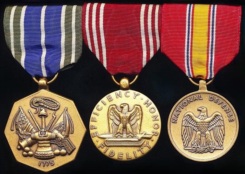 An un-named and un-attributed medal group comprising:- United States Army Achievement Medal- United States Army Good Conduct Medal- United States National Defense MedalThe medals each individually fitted with crimped sliders and mounted in the correct order of precedence on a brass mounting bar. The reverse of the mounting bar retaining its original twin pin posts with clutch-back fittings, and as-wornCondition: EF