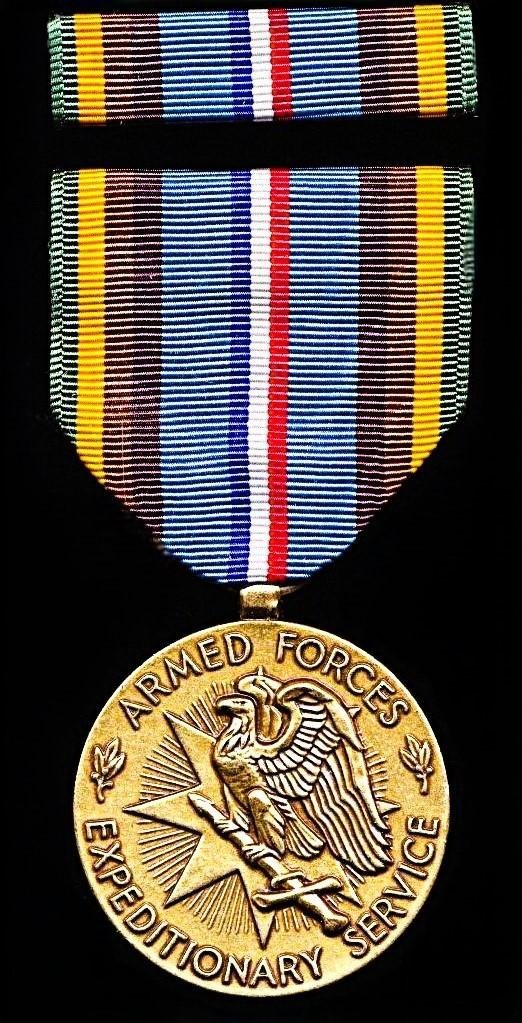 Sold as a set together with loose companion riband bar, this latter with reverse fittings as issuedMedal riband fitted with original mounting brooch with hinged pin and intricate drop-lock clasp fittingsThe reverse of 9mm crimp brooch indented with maker hallmark 'Graco-GI'The Armed Forces Expeditionary Medal (AFEM) was instituted in 1961 by Executive Order of President John Kennedy. The medal is awarded to members of the U.S. Armed Forces who, after July 1, 1958, participated in U.S. military operations, U.S. operations in direct support of the United Nations, or U.S. operations of assistance for friendly foreign nationsThe Armed Forces Expeditionary Medal may be authorized for three categories of operations: U.S. military operations; U.S. military operations in direct support of the United Nations; and U.S. operations of assistance for friendly foreign nations. The medal is only awarded for operations for which no other U.S. campaign medal is approved, where a foreign armed opposition or imminent threat of hostile action was encounteredSince its original conception in 1961, the Armed Forces Expeditionary Medal has been awarded for United States participation in over 45 designated military campaigns. The first campaign of the AFEM was the Cuban Missile Crisis and the award was issued for military service between October 1962 and June 1963. Following this original issuance, the AFEM was made retroactive to 1958 and issued for actions in Lebanon, Taiwan, Republic of the Congo, Quemoy and Matsu, and for duty in Berlin between 1961 and 1963During the early years of the Vietnam War, the Armed Forces Expeditionary Medal was issued for initial operations in South Vietnam, Laos, and Cambodia. The Armed Forces Expeditionary Medal was intended to replace the Marine Corps Expeditionary Medal and Navy Expeditionary Medal, but this never occurred, and both services continue to award their service expeditionary medals and the AFEM, though not concurrently for the same actionCondition: EF