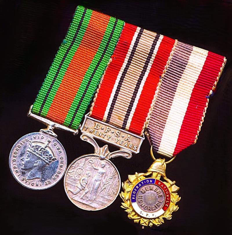 - War Medal (1939-45). Mounted on Defence Medal riband- British Fire Service Association: Silver issue with 'Twenty Years' suspension bar- France: La Federation Nationale des Sapeurs-Pompiers Honorary Medal. Gilt & enamelLa Fédération nationale des sapeurs-pompiers de France (FNSPF), was established in 1901The medals mounted as-worn in the swing style. The silk ribands suspended from a contemporary white metal mounting bar, which latter retains its long hinged pin & clasp fittingsCondition: GVF