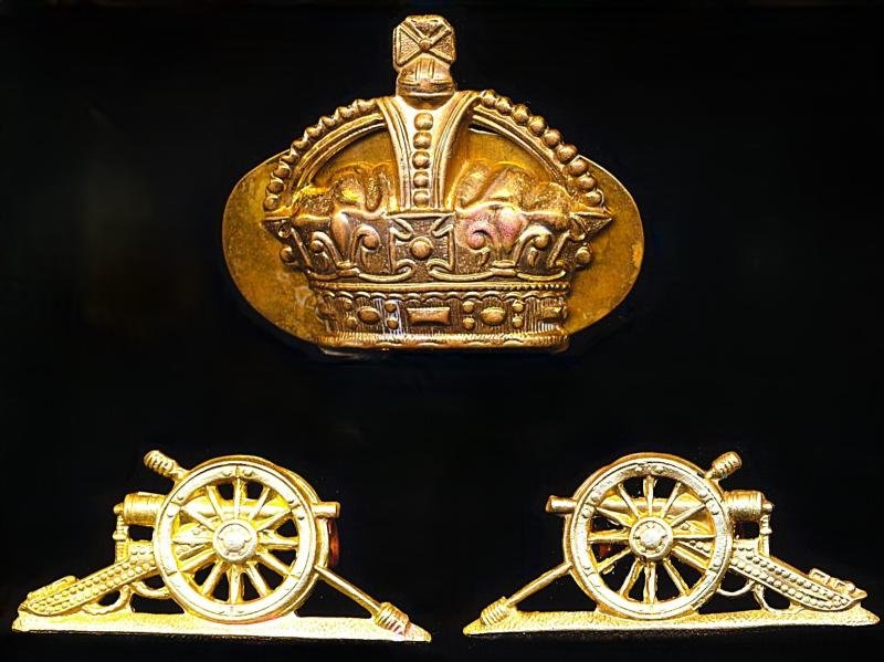 Comprising:2). Battery Sergeant Major sleeve Crown3). Battery Sergeant Major: Pair of 'facing' sleeve gunsWorn circa 1920-1952, including both World Wars & Korean WarAll the insignia complete with their reverse loop fittings as issuedCondition: GVF