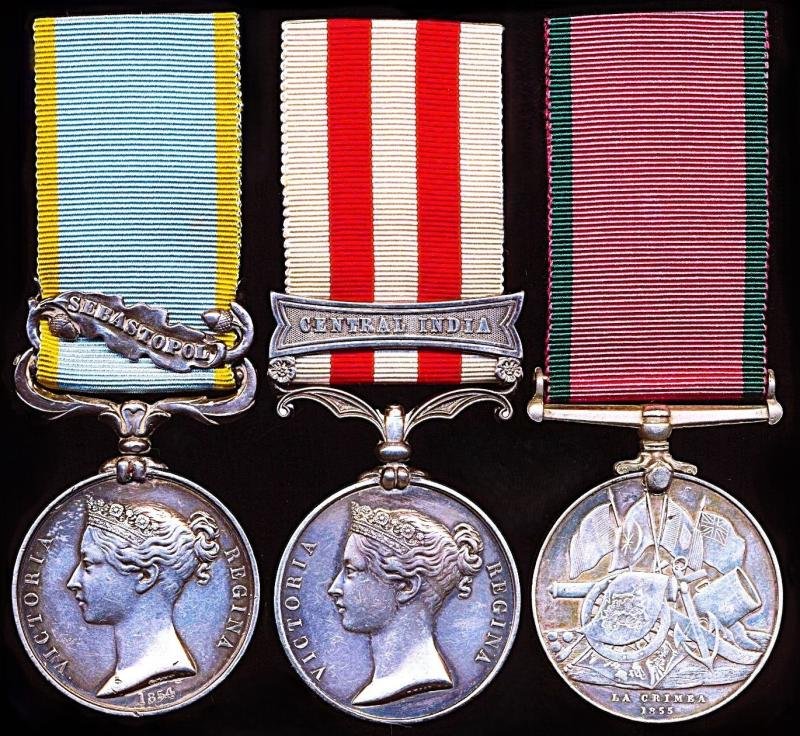 - Crimea 1854-56, 1 clasp, Sebastopol (No. 1848 William Chisholm 72d Highlanders)- Indian Mutiny Medal 1857-59, 1 clasp, Central India (Wm. Chisholm, 72nd Highlanders)- Turkey: Crimea Medal 1855. With 'Sardinian' flag reverseThe Turkish Crimea Medal un-named as issued, and fitted with a replacement white-metal straight suspensionWounded-in-Action: No. 1848 Private William Chisholm is confirmed 'Wounded-in-Action' before Sebastopol on 13 August 1855 (reference the casualty lists published in the London Gazette issue of 28 August 1855)Naming is regimentally engraved in a contemporary 'Gothic' engraved style known for this particular regiment (reference the OMRS publication 'By Order of Her Majesty' The Crimea Medal Institution, Manufacture, Naming and Distribution' (Martin, Pickering & Satterly, 2017). A few letters **** in 'Highlanders now wornMedals & Clasps Verification: William Chisholm of the 72nd (Duke of Albany's Highlanders) Regiment of Foot is confirmed entitled to both the British Campaign Medal and clasps, per the below referenced medal rolls. There is no medal roll in the public domain for the Turkish Crimea medal - however the medal was, by default, an automatic entitlement to anyone who had qualified for the British Crimea Medal:- Crimea Medal with clasp 'Sebastopol': WO 100/31- Indian Mutiny Medal with clasp 'Central India': WO 100/38. Present at Siege of Kotah & Pertabghur- Turkish Crimea Medal: An automatic medal entitlement per referenced British Crimea & clasp entitlementImportant: A search of the respective medals rolls for the Crimea and Indian Mutiny to the 72nd Highlanders, shows that only one man of the name William Chisolm was entitled to both the Cream Medal and an Indian Mutiny Medal, viz No 1814 Private William Chisholm. There was another William Chisholm in the regiment who earned the Indian Mutiny Medal with Central India clasp, viz 3557 Corporal William Chisholm, however this latter only enlisted in the last quarter of 1855, and did not serve in the Crimea - the latter namesake subsequently transferred to the Royal Engineers and later earned a Long Service & Good Conduct Medal as a 'Sapper'After taking his final discharge from the British Army, No. 1848 Private William Chisholm, late 72nd (Duke of Albany's Own) Highlanders, returned to Scotland, where he exchanged his military uniform for a civil uniform, when he accepted an appointment as a Constable with the Partick Burgh Police in Glasgow, Scotland. The Glasgow newspapers of the late 19th Century contain a number of articles and mentions of William Chisholm, who was a well known be-medalled Crimean War & Indian Mutiny veteran in Glasgow. The 'Daily Record and Mail' issue of 22 September 1910, contained the below following obituary:Quote,THINNING THE RED LINEAnother Crimea veteran, Mr. William Chisholm, passed away yesterday at his residence, 370 Dumbarton Road, Partick, at the age of 86. A native of Old Machar, Aberdeenshire, the deceased joined the Army at an early age, and during the sixteen years he was with the colours, he took part in both the Crimean War and the Indian Mutiny. On leaving the Army he joined the Partick police force in 1860, and served as a constable until February 1892, when he retired on a pension. The deceased who was well known and highly respected in Partick, leaves a widow and a grown-up son and daughter.Unquote.Condition: VF