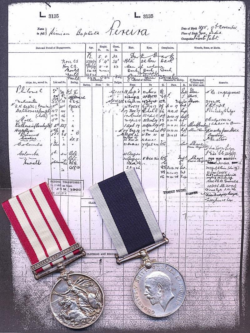 - NGS Medal 1915. GV 'Persian Gulf 09-14' (L.3135. S. B. Pereira, Off. Std. 2 Cl. H.M.S. Philomel.)- Royal Navy LS&GC. GV coinage head issue (L.3135 S. B. Pereira. L. Std. H.M.S. Colombo.)Medals & Clasp Verification: The recipient is confirm to being entitled to both medals and clasps as offered, and further entitled to a 1914-15 Star 'Trio' per the respective medal rolls and service sheet referenced below:- NGS Medal Service 1915. With clasp 'Persian Gulf 09-14': ADM 171/62. Medal sent 19.7.18 while serving Mesopotamia on Gunboat 'H.M.S. Moth'- British War Medal. Silver issue: ADM 171/112. Medal sent to recipient at H.M.S. Colombo- Interallied Victory Medal: ADM ADM 171/112. Medal sent to recipient at H.M.S. Colombo- Naval LS&GC: ADM 171/150. The medal register shows LSGC awarded 1934 and sent to the recipient at H.M.S. Colombi in Ceylon ColonySimian Baptista Pereira was an indigenous Goan of the Christian faith born in the Portuguese Colony of Goa, India, on 11 November 1885. Prior to joining the Royal Navy in Colombo, Ceylon Colony - Simian was employed as a 'Private Valet'. Simian joined the Royal Navy at Colombo, Ceylon Colony, on 18 September 1911. His attestation notes him as a 'man of colour'. Joining H.M.S. Philomel he served with her while she was patrolling the Persian Gulf, hunting slavers and gun runners from the lower Persian Gulf through the 'Horn of Africa' and the Somali CoastHe joined the Light-Cruiser H.M.S. Dartmouth 8 April - 19 July 1914, which appears to have been an unhappy assignment as while his character was classed as 'Very Good' his 'Ability' was graded 'Inferior' curiously he is shown after this as posted to 'Shore' but with no ships or base indicated - he certainly did not qualify or was awarded any 1914-15 Star - and suggests that he was on 'Home Furlough' in the period 1915-16. He next recorded posting was briefly to Royal Navy Depot Bombay, 14-16 November, prior to entering theatre of war 'Mesopotamia', where he was joined H.M.S. Dalhousie (R.I.M. Transport) which in the period 1917-18 was acting as the Depot Ship for the gunboat flotilla plying the great waterways - in particular the Tigris river - and littoral of Mesopotamia (present day Iraq), where British Naval Forces were deployed against the enemy forces of the Turkish Ottoman Empire. Simian served aboard the insect-class gunboats H.M.S. 'Tarantula' 17 November 1917- 18 March 1918, and then with H.M.S. 'Moth', 19 March 1918 to 10 April 1919. Returning to his 'Home' Division or Port of 'Colombo', Simian continued to serve ashore and afloat on bases and ships of the East Indies Squadron. Simian, still recorded as being with the Colombo Division', re-enlisted in the Royal Navy on 27 July 1935 with the service number G./L.X.21866, his final service sheet has the remark 'N. Service 1939-45' - whether this means no service or Naval service is unclearCondition: About GVF