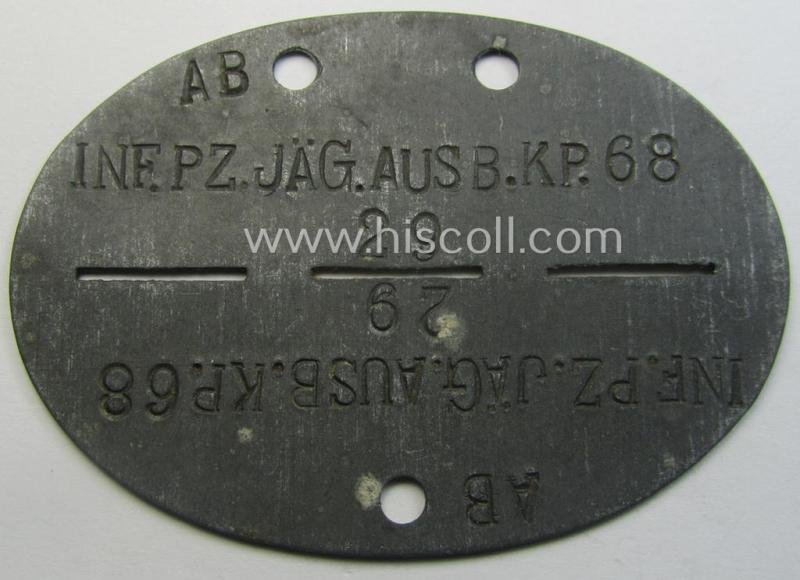 Zinc-based, WH (Heeres) 'Infanterie o. Panzerjäger'-related ID-disc bearing the clearly stamped unit-designation that reads: 'Inf.Pz.Jäg.Ausb.Kp.68' and that comes as issued and/or worn